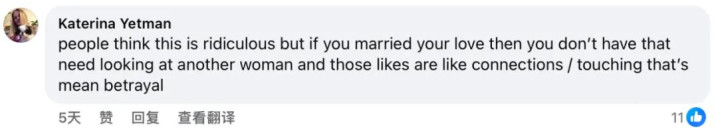 “人们觉得这很荒谬,但如果你嫁给了你的爱人,你就不会有这种想要关注其他女性的欲望,而那些点赞就像是联系/互动,这意味着背叛。”