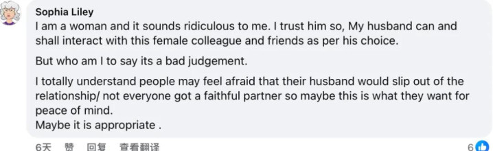 “我是一名女性,对我这听起来很荒谬。我也相信他,所以我的丈夫可以也应该按照他的意愿与女同事和朋友互动。